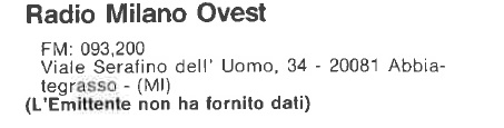del Maggio '81 che la indica trasmettere sui 93,200 da Abbiategrasso in Viale Serafino dell'Uomo al civico 34.