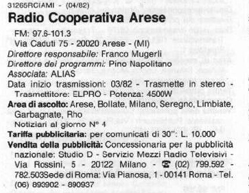 - il pomeriggio prevedeva l'omonimo "Pomeriggio in musica di Radio Cooperativa Arese", che invece ha avuto una continuitá pluriannuale.
