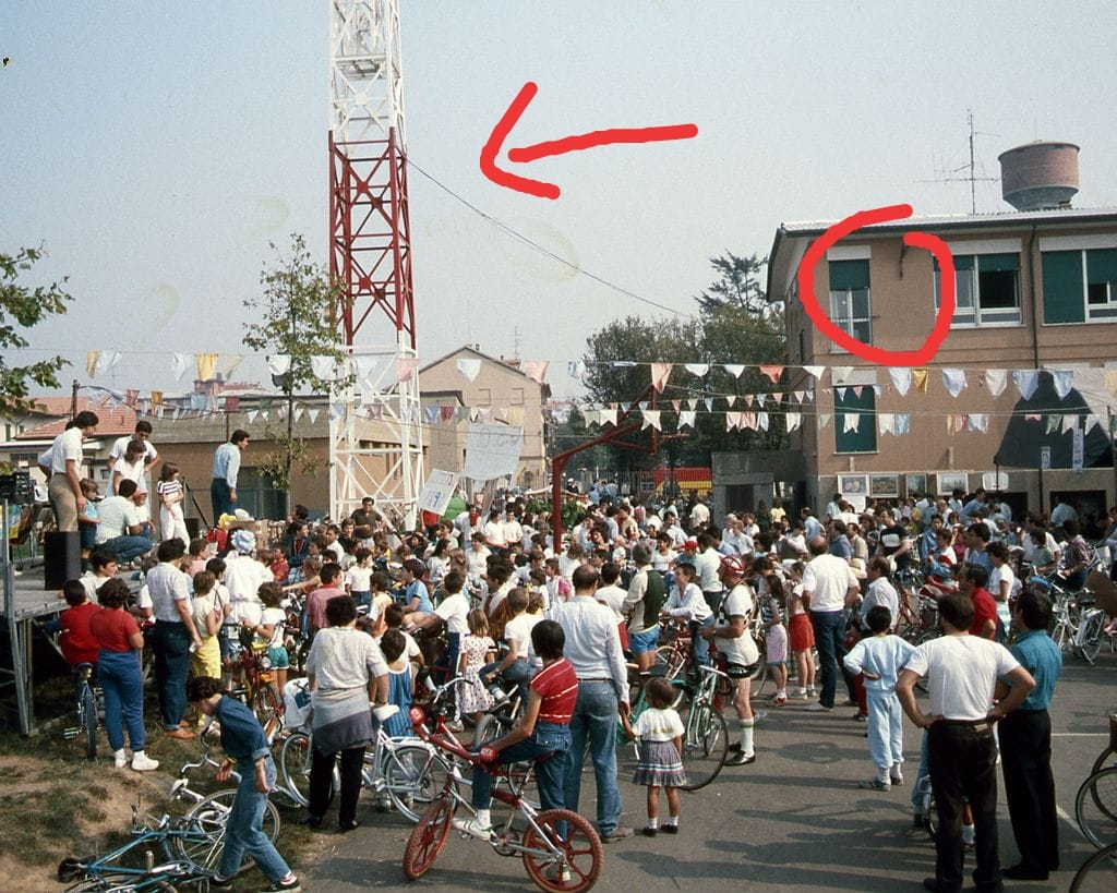 del campo di calcio dell'oratorio e collegato con un cavo aereo di qualche decina di metri all'edificio dell'oratorio dove il trasmettitore trovava spazio