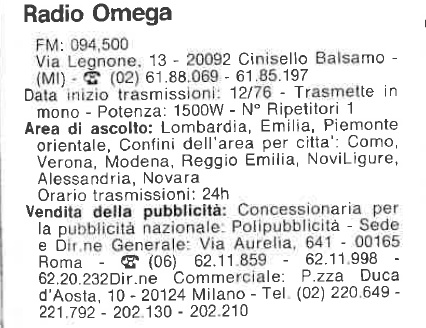 Nata sul finire del 1976 a Cinisello Balsamo in Via Legnone 13 fu probabilmente la prima radio privata ad avere un ripetitore sul Monte Penice
