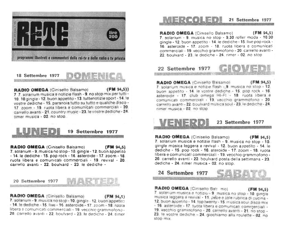 Frequenza di trasmissione 94,500 mhz, qui il palinsesto settimanale del Settembre 1977.