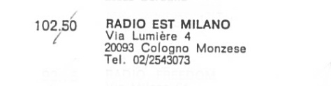 lasciando libera la frequenza 102.5 nell’hinterland milanese, dove dalla provincia di Bergamo si sentiva la stazione “Radio Trasmissioni Lombarde”