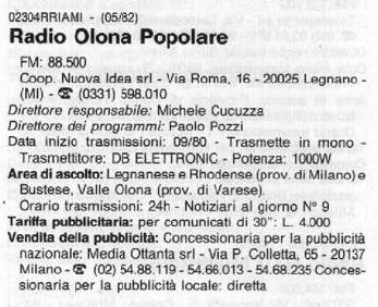 La sede era in Via Roma 16 a Legnano e la frequenza di trasmissione 88.500 Mhz.