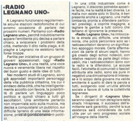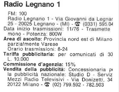 Emittente nata nel Novembre 1976 con sede in Via Giovanni da Legnano 25 a Legnano.