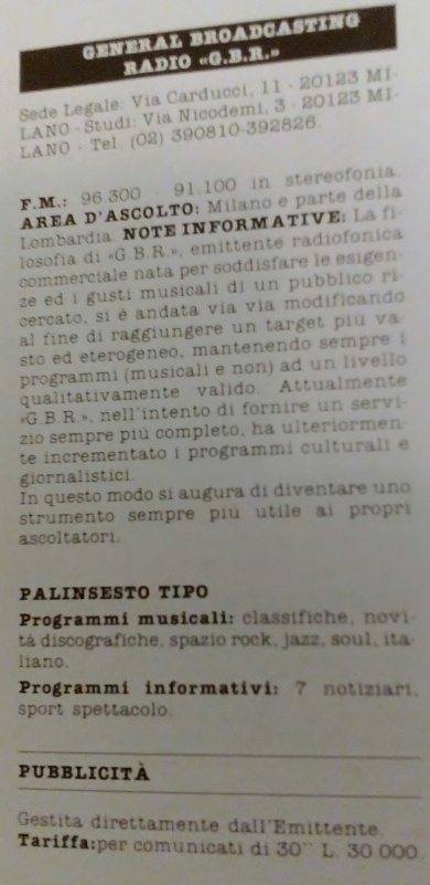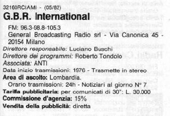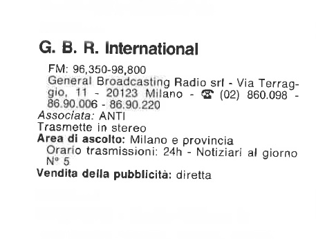 dalla quale in effetti prendeva le mosse), Gbr International, acronimo di General Broadcasting Radio, ebbe sede iniziale in Via Terraggio 11 .