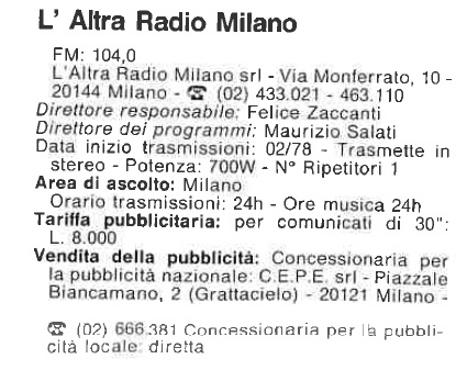 La chiusura de L' Altra Radio Milano consenti' l'avvio delle trasmissioni di