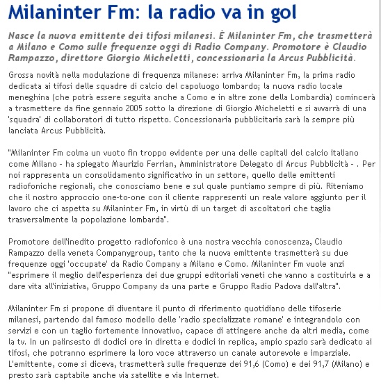Milaninter fm e' il nome con cui debutta nel Gennaio 2005 la talk radio dedicata