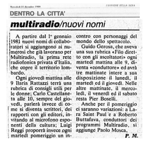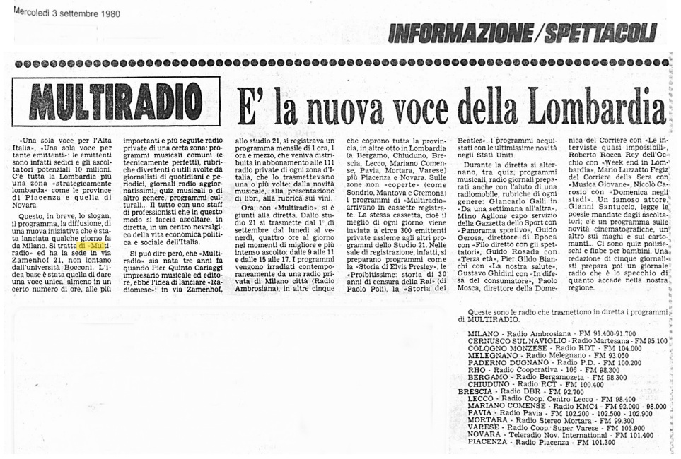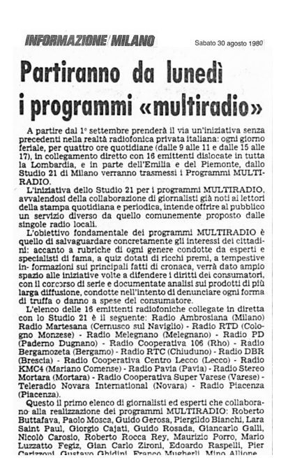 Un'idea che Cariaggi avrebbe poi effettivamente realizzato nei primi mesi del 1980, collegando in ponte radio 20 stazioni in Lombardia per distribuire,