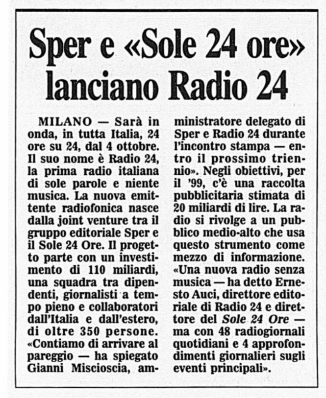 Tra i primi collaboratori figura Giancarlo Santalmassi, già giornalista del TG2 e direttore di Radio Rai che su Radio 24 conduce le trasmissioni Viva Voce