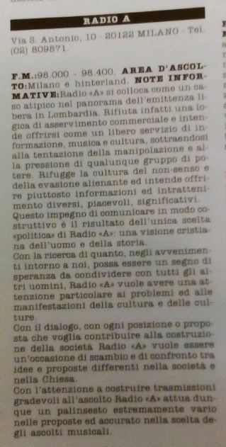 Allacciata via cavo telefonico a Radio Vaticana Radio A ne ritrasmette i programmi informativi, facendoli poi arrivare a Torino e nel Triveneto.