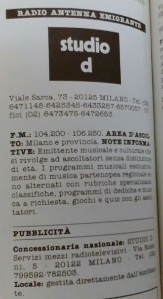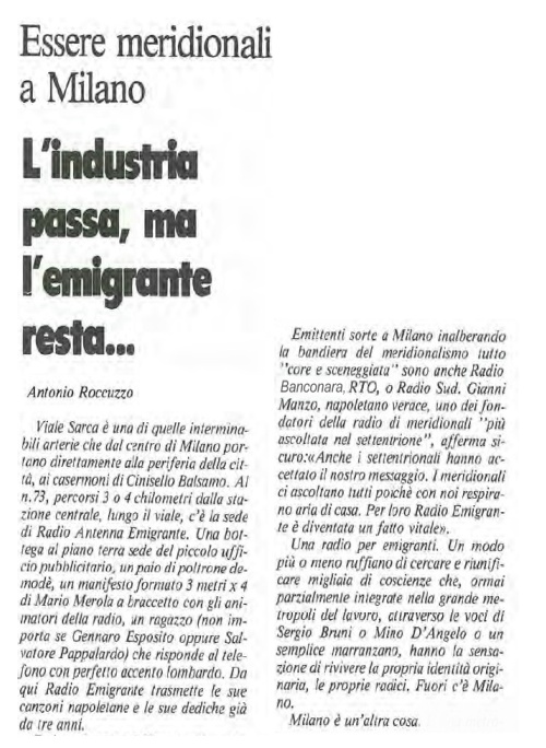 Giugno del 1980 è stata una delle prime radio milanesi (e forse la più nota) a dedicare la sua programmazione ai numerosi emigrati meridionali