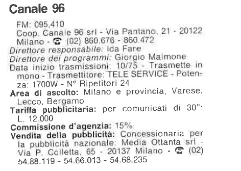 La prima sede di Canale 96 (che irradia i suoi programmi dagli fm 95,200, donde il nome) è in via Mac Mahon presso un