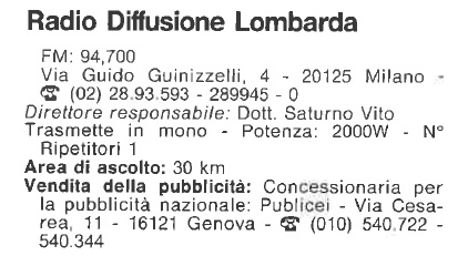 Radio Diffusione Lombarda nasce l’8 aprile 1978, nel momento più euforico della radiofonia "libera" milanese.
