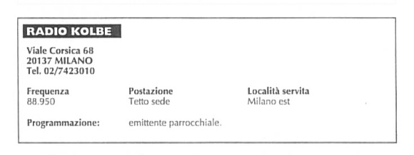 Attiva sino al 1993, quando chiuse per effetto dell'entrata in vigore della legge Mammì, l'emittente del Centro Kolbe di Milano è stata la voce della Parrocchia Immacolata e S.Antonio dei frati minori conventuali di Padova