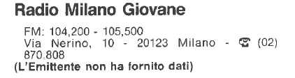Radio Milano Giovane nasce ufficialmente nel Giugno del 1976, inizialmente operante sulla frequenza 105.3 Mhz per spostarsi sui