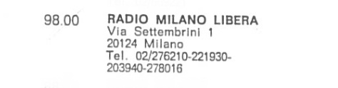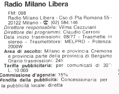 ... C’era però un’altra stazione di un certo peso: Radio Milano Libera, FM 98 MHz, con sede in Via Settembrini 1 .