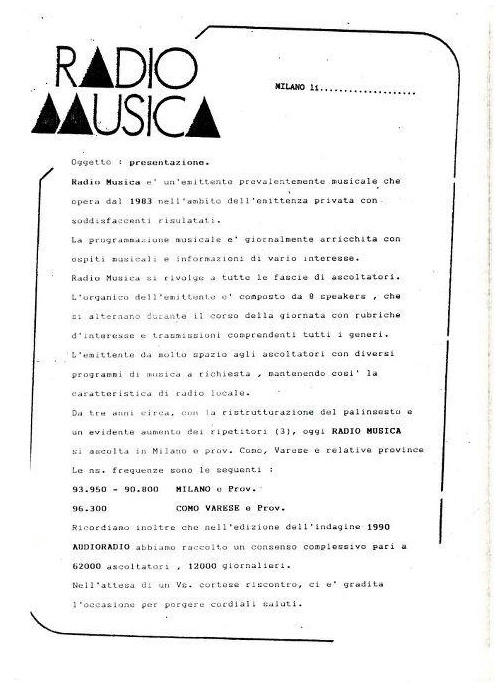 (1991) Radio Musica è un'emittente prevalentemente musicale che opera dal 1983 nell' ambito dell' emittenza privata con soddisfacenti risultati.