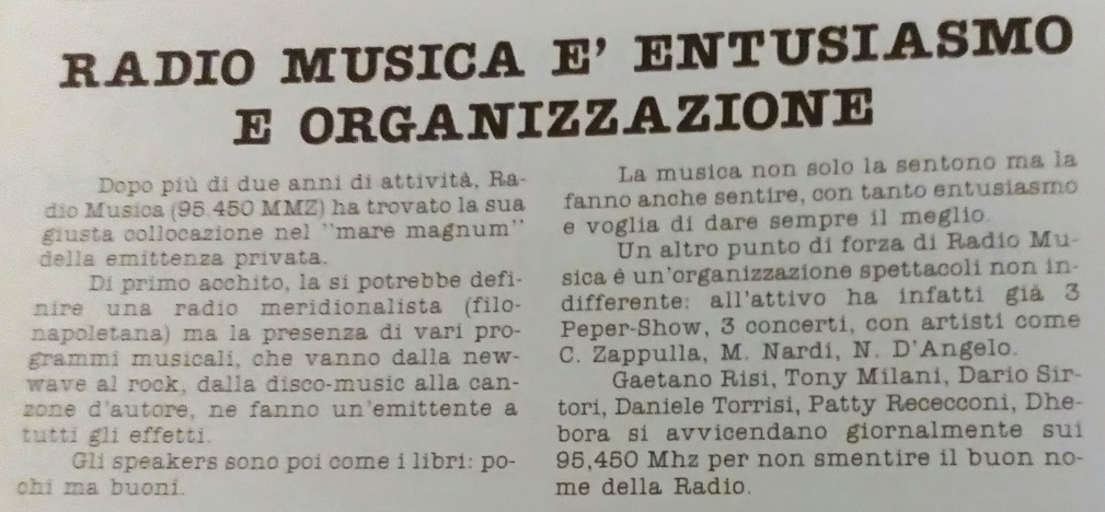 (1985) Dopo più di due anni di attività, Radio Musica (95,450 Mhz) ha trovato la sua giusta collocazione nel "mare magnum" della emittenza privata.
