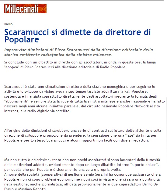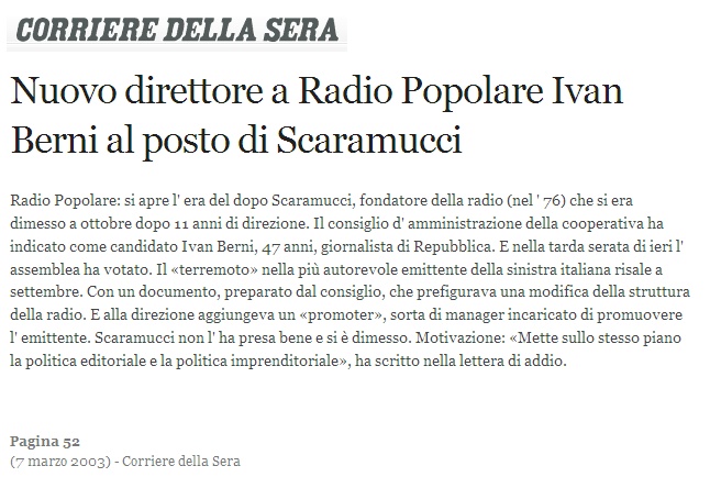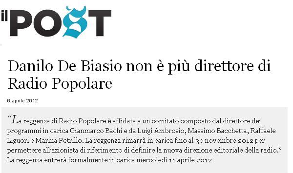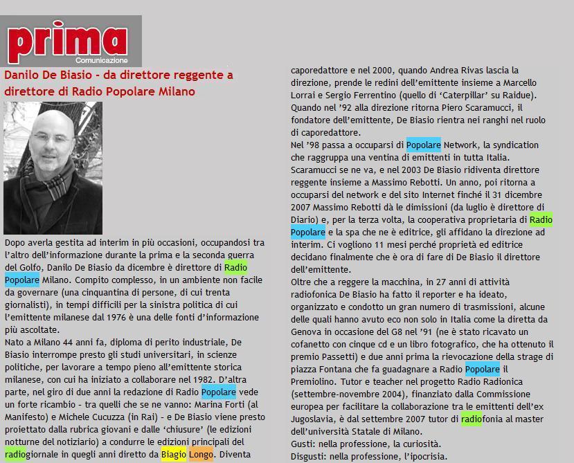 Biagio Longo lascia Radio Popolare: la direzione è assunta da un quartetto di caporedattori: Bruna Miorelli, Paolo Hutter, Umberto Gay, Marcello Lorrai.