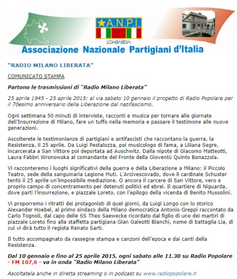 Per il 70° anniversario della Liberazione Radio Popolare fa parlare protagonisti e testimoni, riscopre luoghi ed episodi, ripropone le musiche di allora con la trasmissione