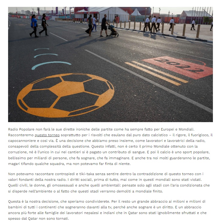 A differenza delle precedenti occasioni, Radio Popolare segue i mondiali di calcio non con trasmissioni ironiche ma da un punto di vista