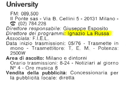 A metà del 1976 nacque Radio University, che ebbe la sua sede in via Mancini al n.1, nello studio dell’onorevole Franco Servello.