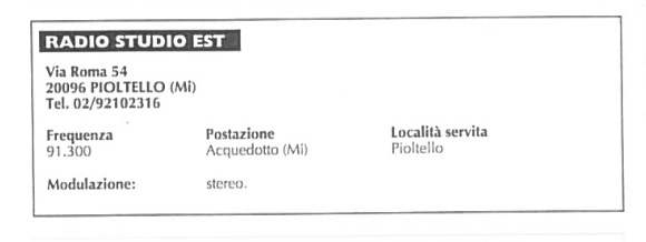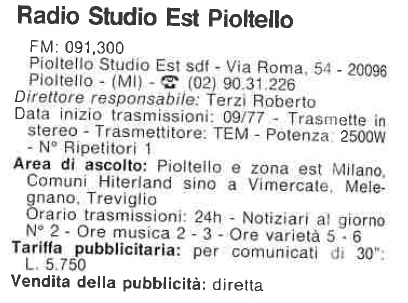 Nata nel Settembre 1977 Radio Sudio Est aveva sede in Via Roma 54 a Pioltello.