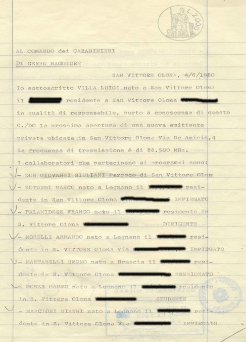 di occupazione della frequenza, inizialmente 88.500Mhz e i nominativi dei primi collaboratori.